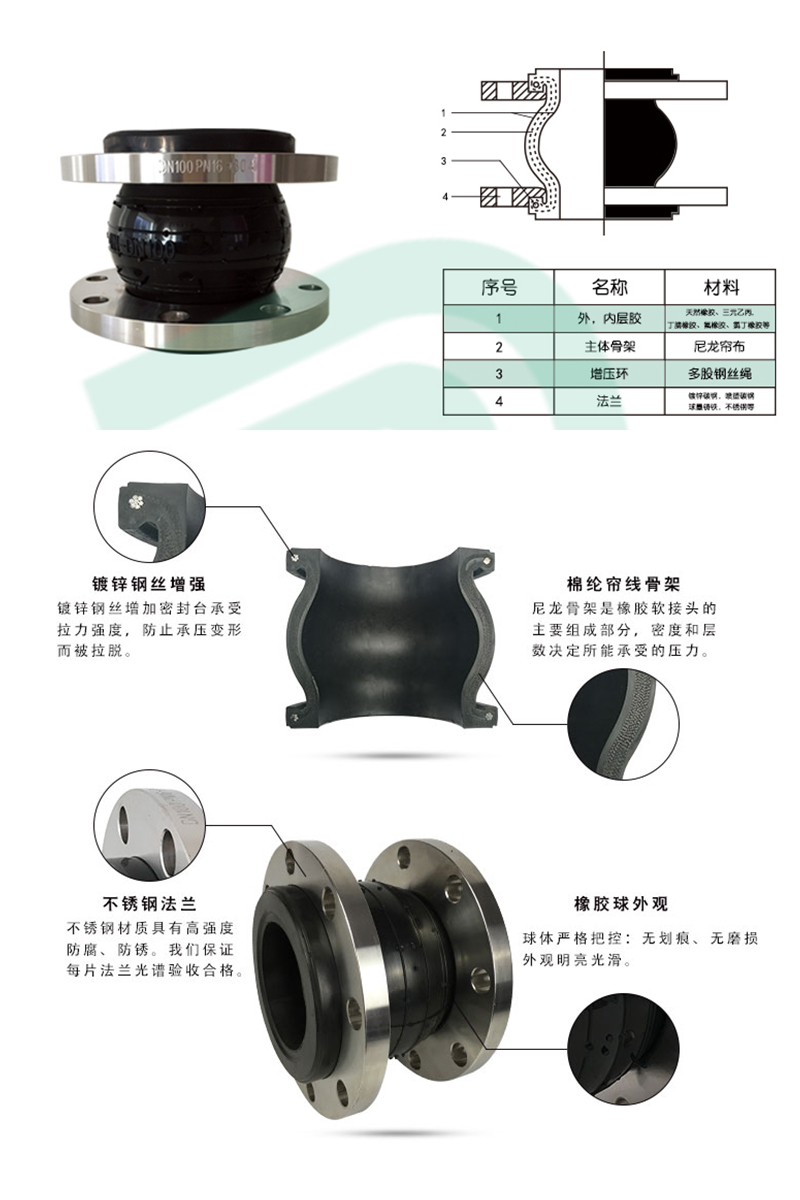 帘子布含有大量纤维组织,可以提高橡胶软接头的使用性能,橡胶软接头承受管道介质压力,帘子纤维起到整体橡胶拉伸和增强的作用。即使少数橡胶软接头纤维组织压力过大,纤维断裂也不会影响橡胶软接头的爆破压力。使用或储存橡胶软接头时,应避免高温和酸碱环境。