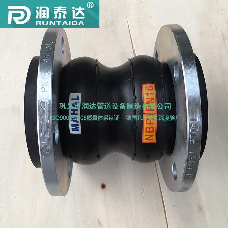 通过加长橡胶接头支撑模具,来做到橡胶 接头的加长,但是在制造过程中,由于橡胶膨胀节的结构影响,会造成双球体可曲挠橡胶接头在制造过程中,相邻的两个橡胶膨胀节之间的胶量不足而导致橡胶膨胀节直接壁厚较薄,造成承压能力的下降,所以在双球体可曲挠橡胶接头橡胶膨胀节部位,加装金属加强环,可以有效的避免橡胶膨胀节在高压环境下的破裂,同时也解决了双球体橡胶接头承压能力较低的缺陷 双球体橡胶接头连接 一般有丝扣连接、法兰连接和卡箍连接等方式。它的球体是由内胶层、增强层有多层刮胶锦纶帘子布、外胶层复合的橡胶管组成。根据介质的不同所采用的橡胶材质也是不同的,其中有天然胶、丁苯胶、丁基胶、丁腈胶、三元乙丙胶、氯丁胶、硅橡胶、氟橡胶等等多种材质。分别具有耐热、耐酸、碱、耐腐蚀、耐磨、耐油等功能。