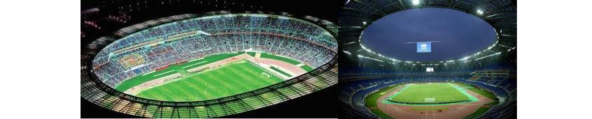 體育場底面形狀近似橢圓形,面積約80000平方米,總建築面積155800平方米,主體結構采用鋼筋混凝土框架和型鋼混凝土結構支承的鋼結構屋蓋。屋頂結構采用V字型平行弦桁架懸挑結構,以表現運動的動感和輕快感;鋼結構屋架平面呈扁長橢圓,長軸約471m,短軸約370m,沿長軸對稱;屋面中心不封閉,在運動場場地上方留出近似橢圓形空洞,以不同曲率坡向地面,近地面時收于波浪形起伏的環形鋼管桁架圈梁處,再由環向布置的92組鋼桁架柱連接到基礎的混凝土承台上。整個結構布局合理,空間性能好,給人以力度感、穩定感的同時,又極富韻律,輕巧而活潑。