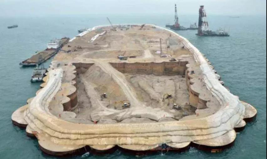 橋隧轉換的關鍵在于人工島。修建人工島可不僅僅是用海底的泥沙堆砌一座島出來,這座島必須能夠對抗方向不定的洋流和海風。如果沒有結實的加固,必然一沖即散。
