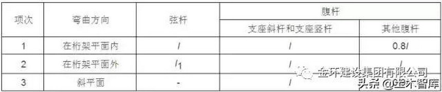 注:1.l為構件的幾何長度(節點中心間距離);l1為桁架弦杆側向支承點之間的距離。2.斜平面系指與桁架平面斜交的平面,适用于構件截面兩主軸均不在桁架平面内的單角鋼腹杆和雙角鋼十字形截面腹杆。