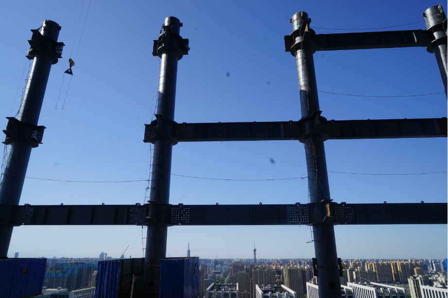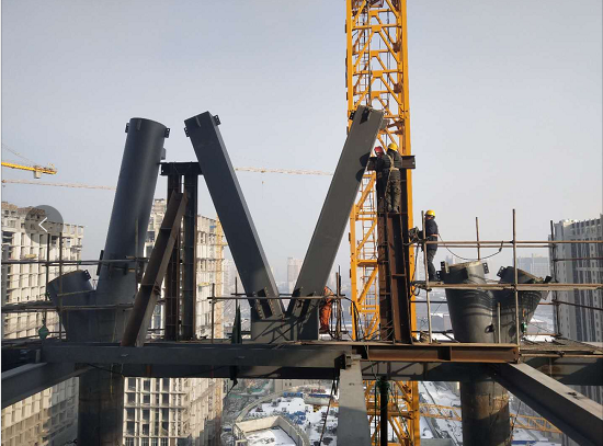 ▼圓形鋼柱吊裝,打造超200米高層,城市風光一覽無遺