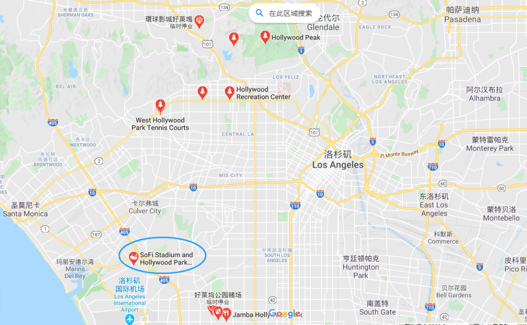 而以好萊塢命名的——好萊塢公園(Hollywood Park),地處洛杉矶市區西南,占地約1820畝,靠近洛杉矶國際機場,距離西海岸不到5公裡。建成後将擁有洛杉矶體育場、7萬平米辦公空間、8萬平米零售空間、2500個現代住宅和300間五星級酒店客房為一體的商業綜合體,成為洛杉矶西部最重要的娛樂和商業中心。