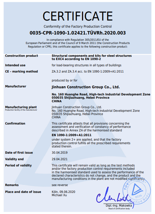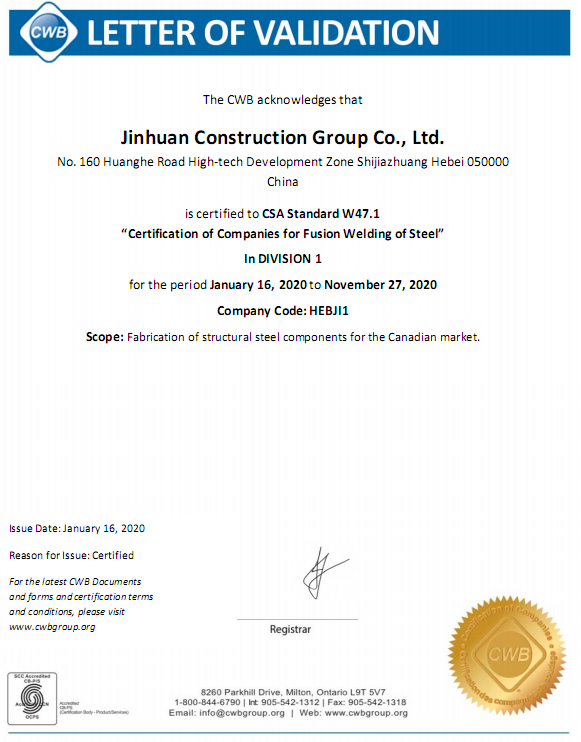 除美标AISC認證以外,金環建設集團還連續多年通過了加拿大焊接協會CWB認證、歐盟EN 1090認證,成為國内極少數同時擁有這三大國際鋼結構産品管理體系認證的企業,代表了金環通過了全球最具權威的鋼結構産品管理體系的認證,擁有了通往歐美高端鋼結構市場的“通行證”。