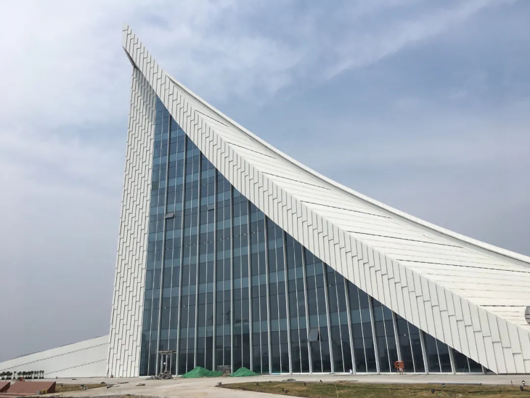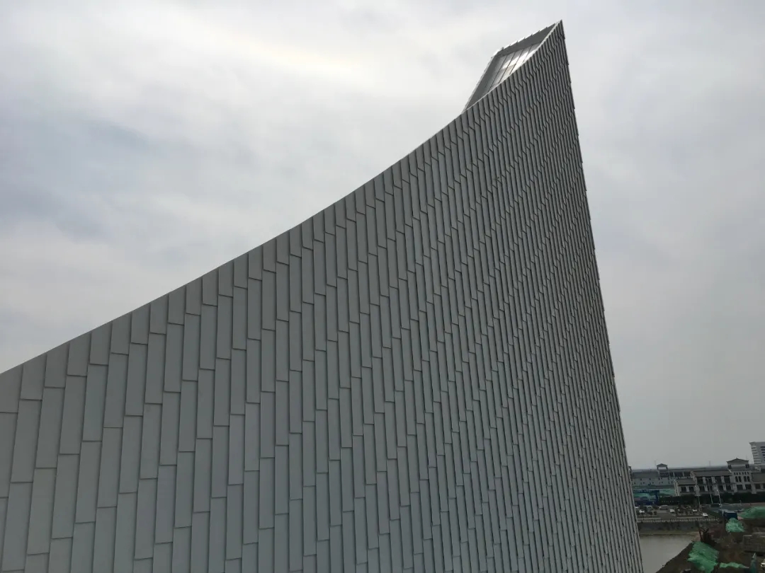 ▼南翼北魚鱗狀的立面鋁單闆幕牆,屬于全國第一例魚鱗狀幕牆,已申請國家發明專利