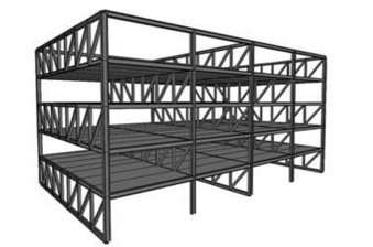 交錯桁架結構主要由桁架、柱、樓闆和縱向連梁組成。①結構柱布置在房子的四周;②桁架的高度與層高相同,長度與房屋寬度相同;③桁架的兩端支承于外圍柱子上,桁架沿房屋縱向隔榀布置,沿房屋高度在相鄰的柱列上下交錯布置。