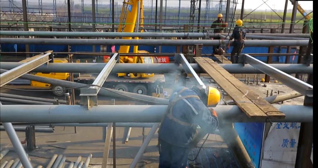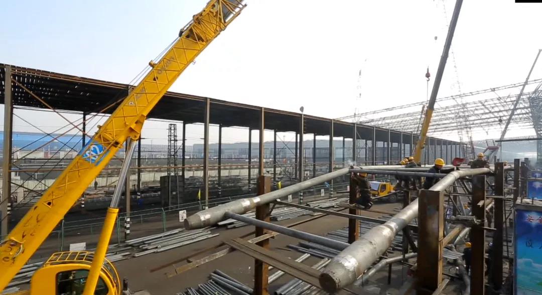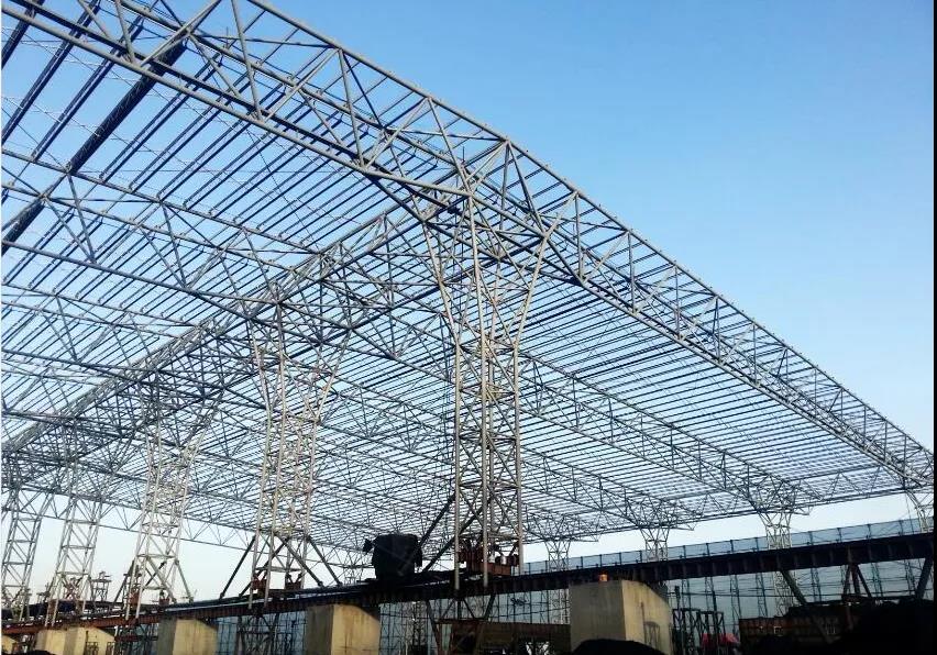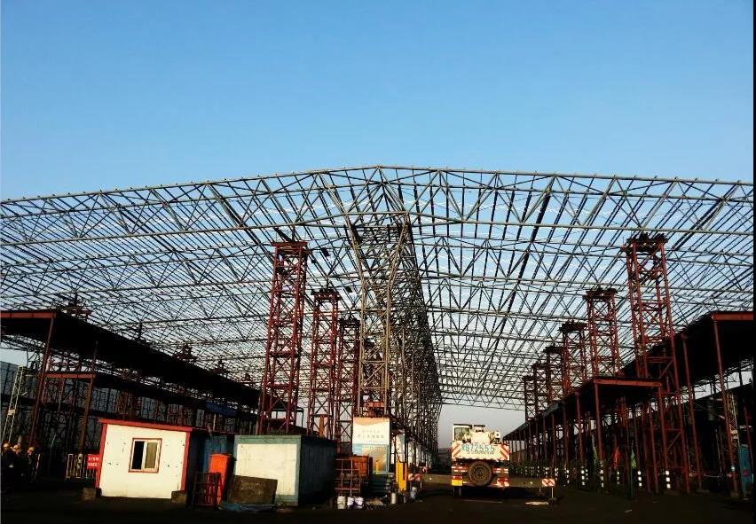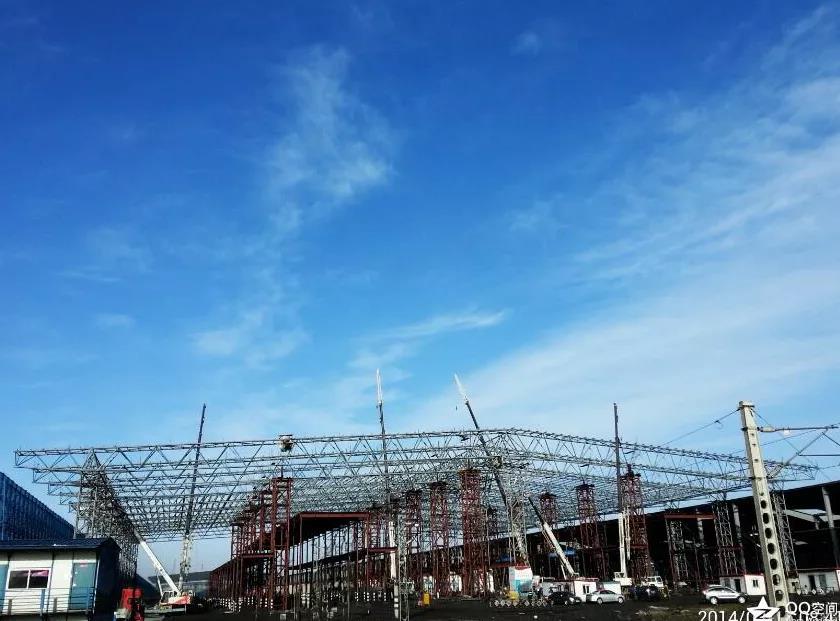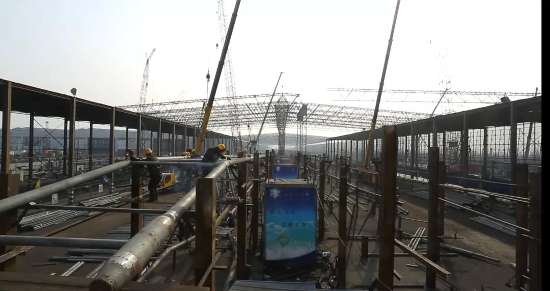 鋼結構長1660米,寬123米,用鋼量8316噸,其中屋蓋桁架及下部支撐柱6109噸,屋面檩條1891噸鋼結構現場地面拼接,在工期時間僅有4個月的情況下,工程任務非常大。