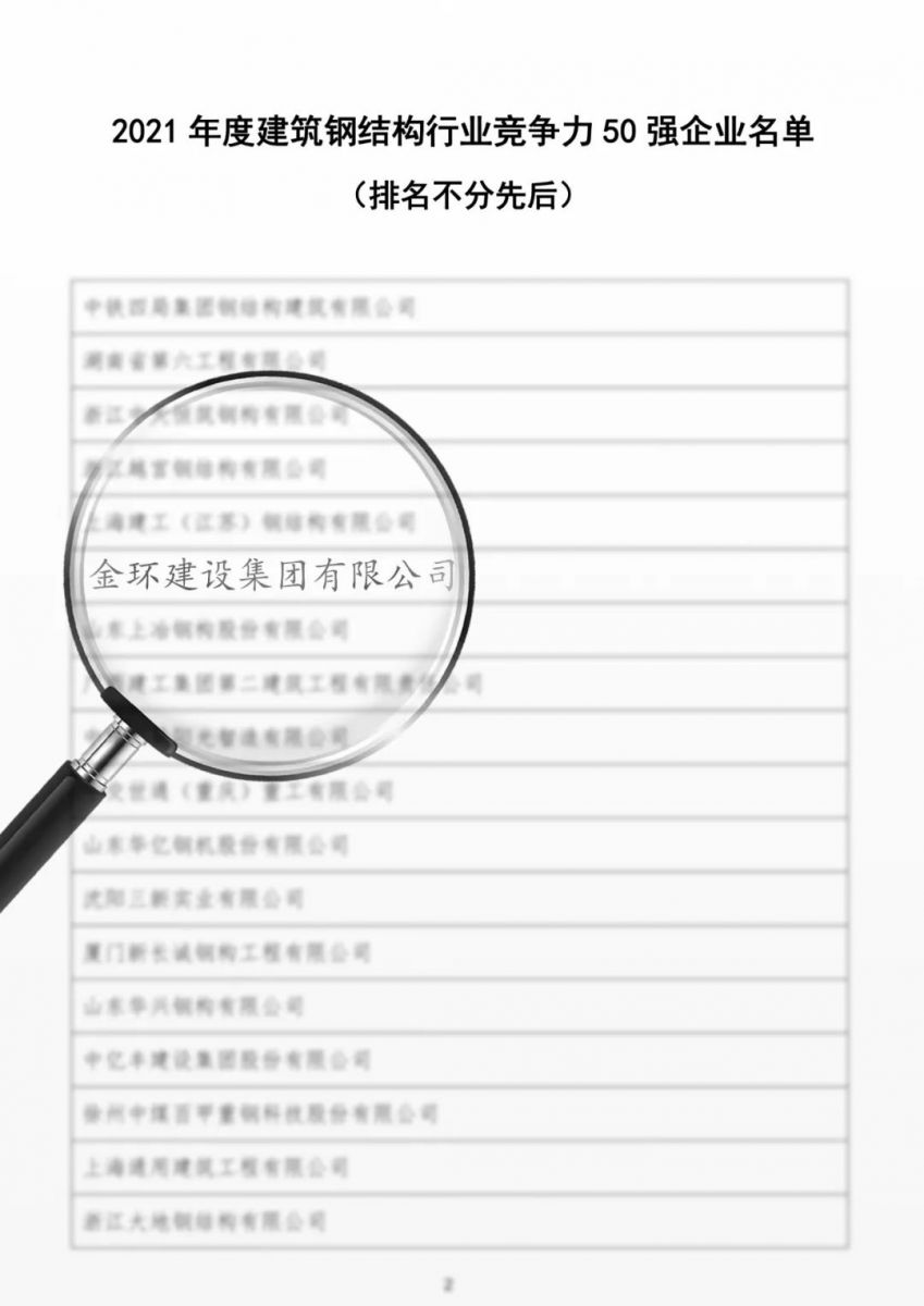 2022年7月,由中國建築金屬結構協會評選的2021年度建築鋼結構行業誠信評價結果和行業競争力榜單公布。金環建設集團再度榮登2021年度建築鋼結構行業競争力50強企業、2021年度建築鋼結構行業誠信企業榜單。