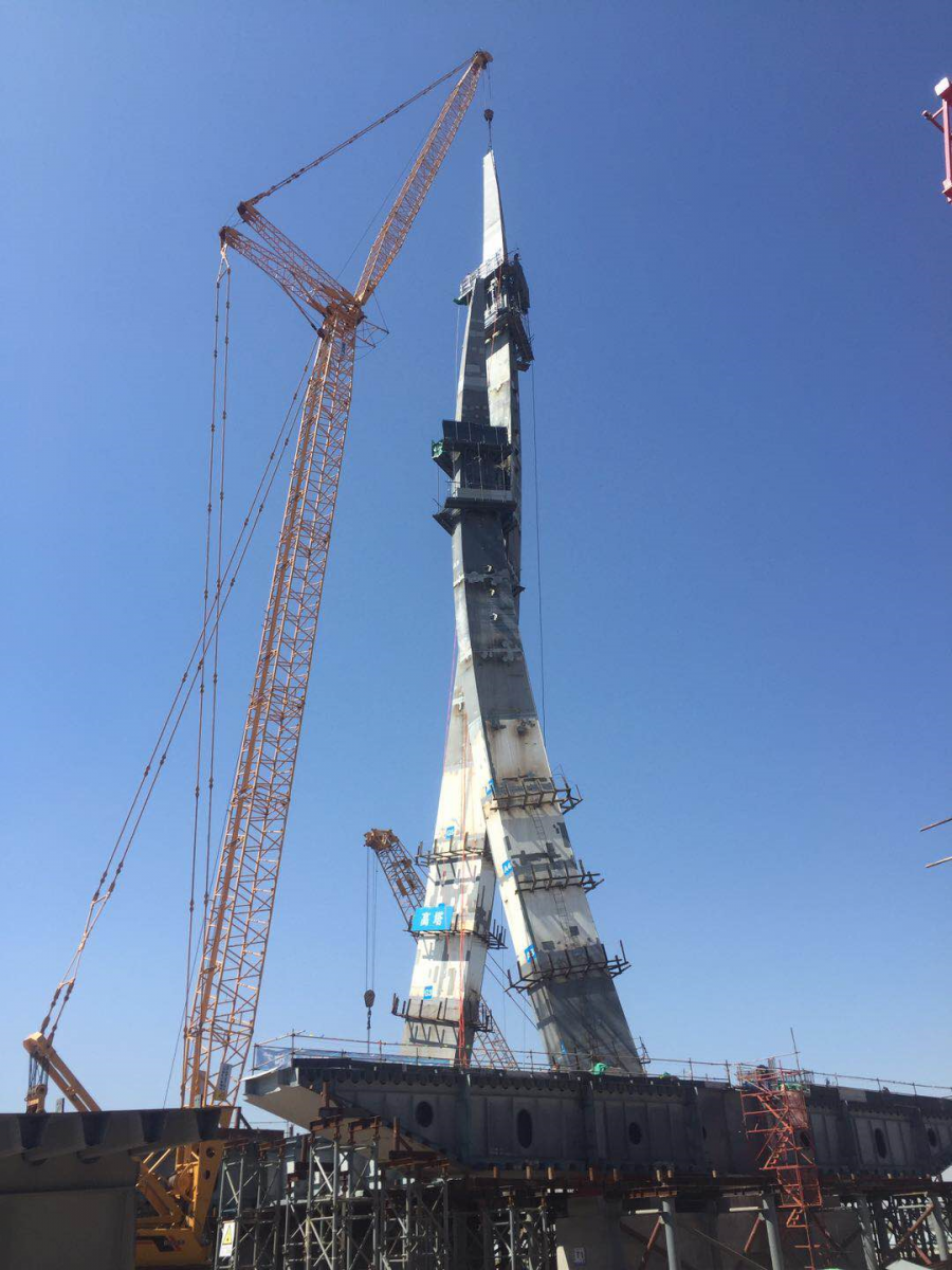 項目中的兩個相互環繞的橋塔無疑是大橋的點睛之筆。橋塔有高低兩塔肢,其中高塔塔柱高95m,由16個節段組成;矮塔塔柱高75m,由12個節段組成。高塔與矮塔結構相似,均為變截面梯形截面。橋塔上塔柱為鋼結構,下塔柱為鋼混組合結構。高低兩塔肢中間通過正六邊形斷面橫梁連系。