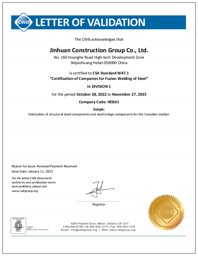 本次加拿大焊接認證(CWB)認證的順利通過,是對金環建設集團鋼結構加工制造能力的高度肯定和認可,為金環建設集團繼續開拓海外業務,實現鋼結構産品國際化迅速發展提供了有力的支撐。