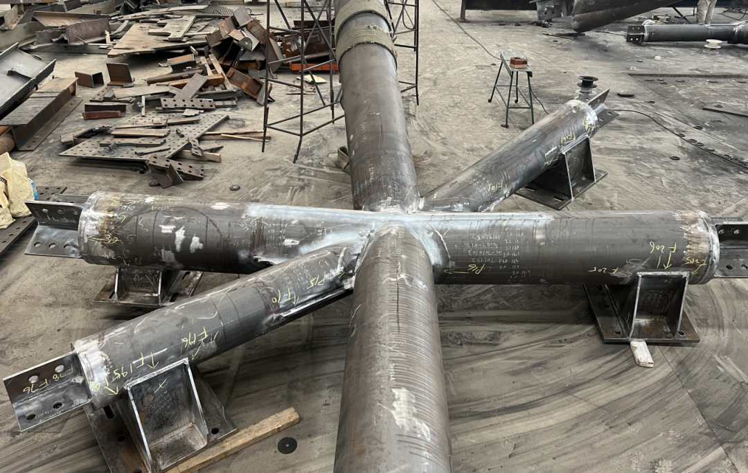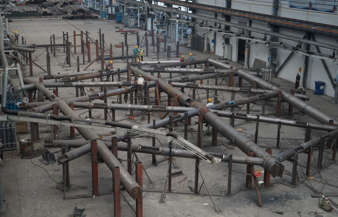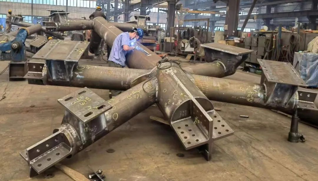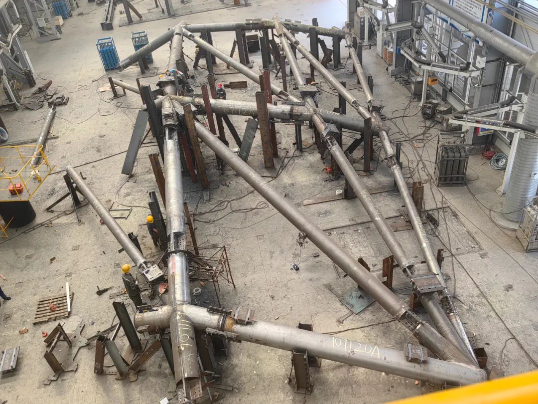 籃球館網殼鋼結構的菱形對角線造型,使得其中絕大部分連接節點是由6根管連接而成,而整個籃球館曲面的球體造型,又使得幾乎每一根管的長度和連接角度都不一樣,在管與管的組對過程中,需要嚴格控制精度。