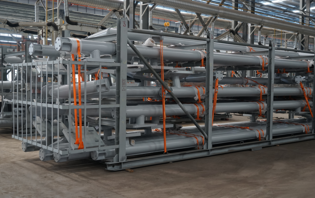 ▼噴漆:通過嚴格執行操作規範、精細加工處理,并對漆膜厚度均勻度偏差、油漆表面光亮度、油漆附着力等進行檢驗,确保塗裝質量。下圖為AESS構件塗漆後的完成效果,可以看到構件表面光滑亮澤,猶如鏡面效果,極為美觀。
