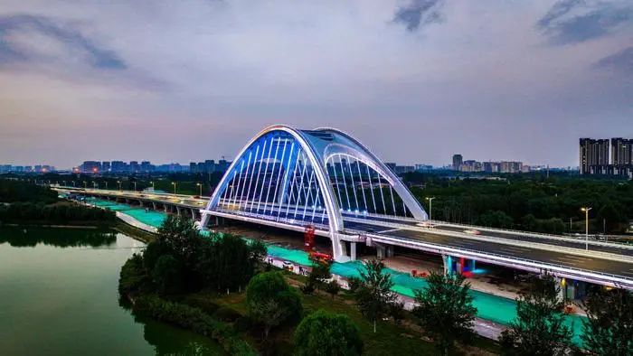 泊水公園特大橋已經成為複興大街上一道亮麗的風景線。高達48米的環形橋拱立于環城水系碧綠的河面之上,周邊繁盛的樹木郁郁蔥蔥。夜裡大橋上燈光秀亮起,色彩斑斓,光彩奪目,成為複興大街上一個标志性的景觀。(項目更多信息請戳→金環承建 | 複興大街泊水公園特大橋通車在即!)
