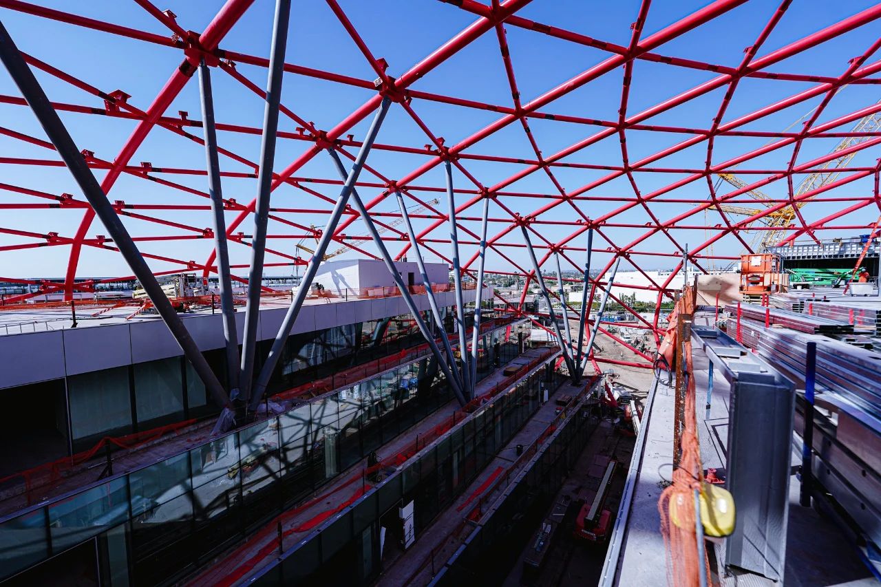 作為高規格打造的體育和娛樂中心,英格伍德籃球館(Intuit Dome)定位高端、理念超前、設計新穎。該籃球館由國際知名建築設計公司AECOM設計,整體造型為一個半橢圓球體。其中最引人注意的是屋頂的菱形對角造型,這一設計靈感來源于籃球命中時刷網而入的狀态。這種菱形對角的造型,均由鋼結構來呈現。