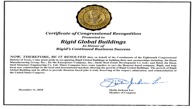 雙方以金環建設集團并購美國RIGID公司為中心展開了讨論。金環建設集團自2010年10月8日,牽頭注資1300萬美元完成并購,并購後企業更名為RIGID GLOBAL BUILDINGS,中方占比51%。至2016年中方增持,股份占比75%,外方25%。形成了一套完整的,合理的管理與運營體系。目前RIGID公司年主營業務收入已經達到6千萬美金,擁有員工400人,鋼結構産能已達3萬噸。鑒于金環建設集團對休斯敦市作出的貢獻,美國國衆議員Shelia Jackson Lee為金環建設集團頒發了Certificate of Congressional Recognition(美國衆議院榮譽狀)。該榮譽狀是對金環建設集團在拯救休斯敦當地企業,提供就業崗位所作出的突出貢獻的認可。集團董事長劉保忠先生還獲得了休斯敦市榮譽市民的稱号。