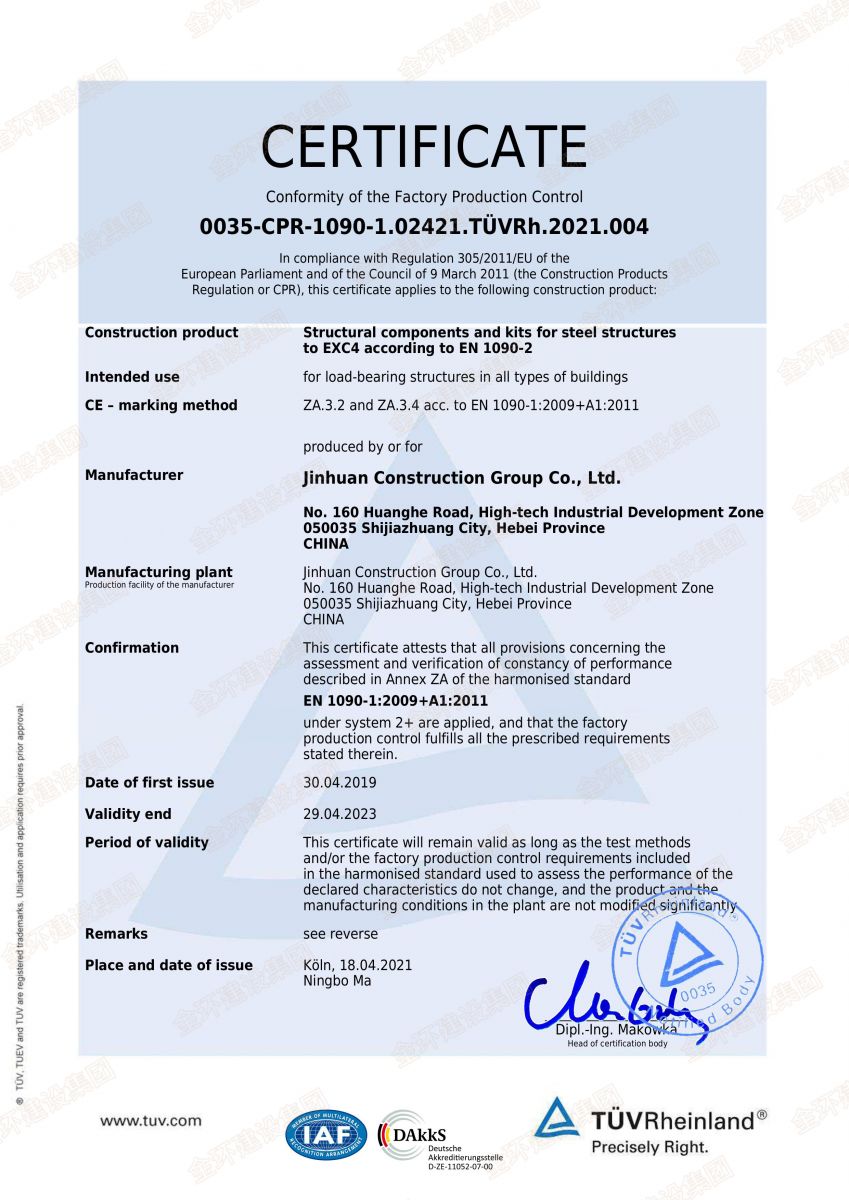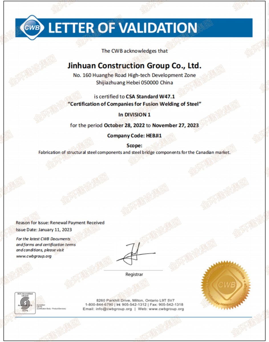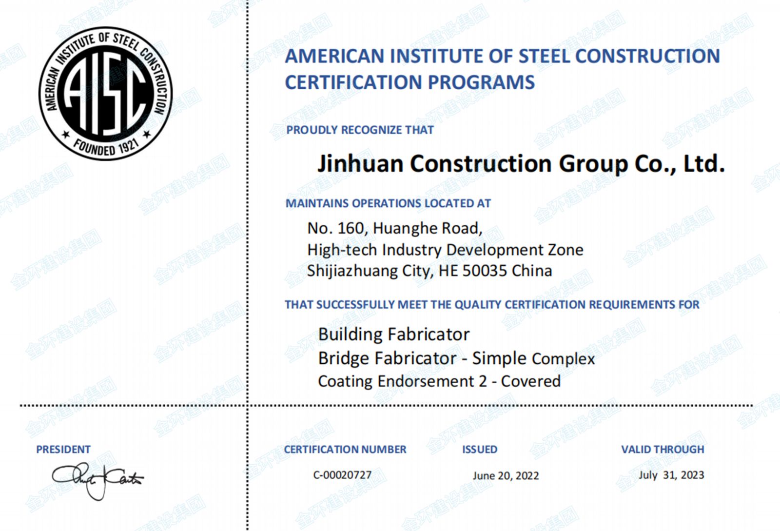 金環建設集團擁有建築工程施工總承包一級資質、鋼結構工程專業承包一級資質、輕型鋼結構工程設計專項甲級、中國鋼結構制造特級企業資質等多項資質認證,并且通過了ISO 9001質量管理體系、環境管理體系和職業健康管理體系認證,同時獲得美國鋼結構協會AISC認證,加拿大焊接協會CWB以及歐盟EN 1090和歐盟EN 3834等多項國際認證。