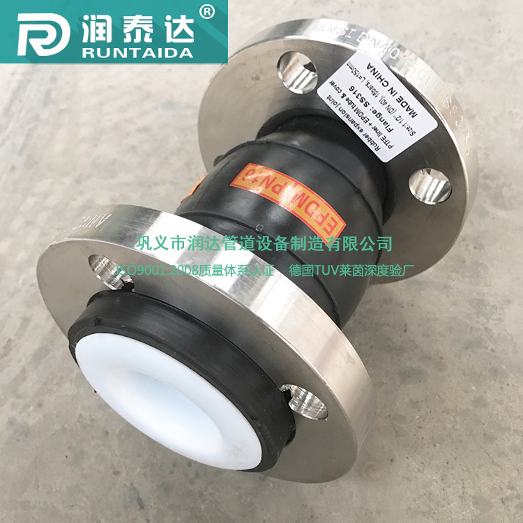 衬四氟橡胶接头具有减振、耐高温、能挠曲、耐摩擦等特点。适用于管道错位差、位移、尺寸变化及振动部位的连接。可作贮罐、槽车等设备的给、排料管,还可作其它特殊之用。其使用范围较广泛,作用较全面。衬氟橡胶接头的四氟具有优良的化学稳定性、耐腐蚀性,是当今世界上耐腐蚀性能材料之一,除熔融和液氟外,能耐其它一切化学,在旺水中煮沸也不起变化,广泛应用于各种需要抗酸碱和有机溶剂的。密封性,高润滑不粘性、电绝缘性和良好的抗老化耐力、耐温优异(能在+250℃至-180℃的温度下长期工作)。衬氟橡胶接头适用于各种介质的管道连接。